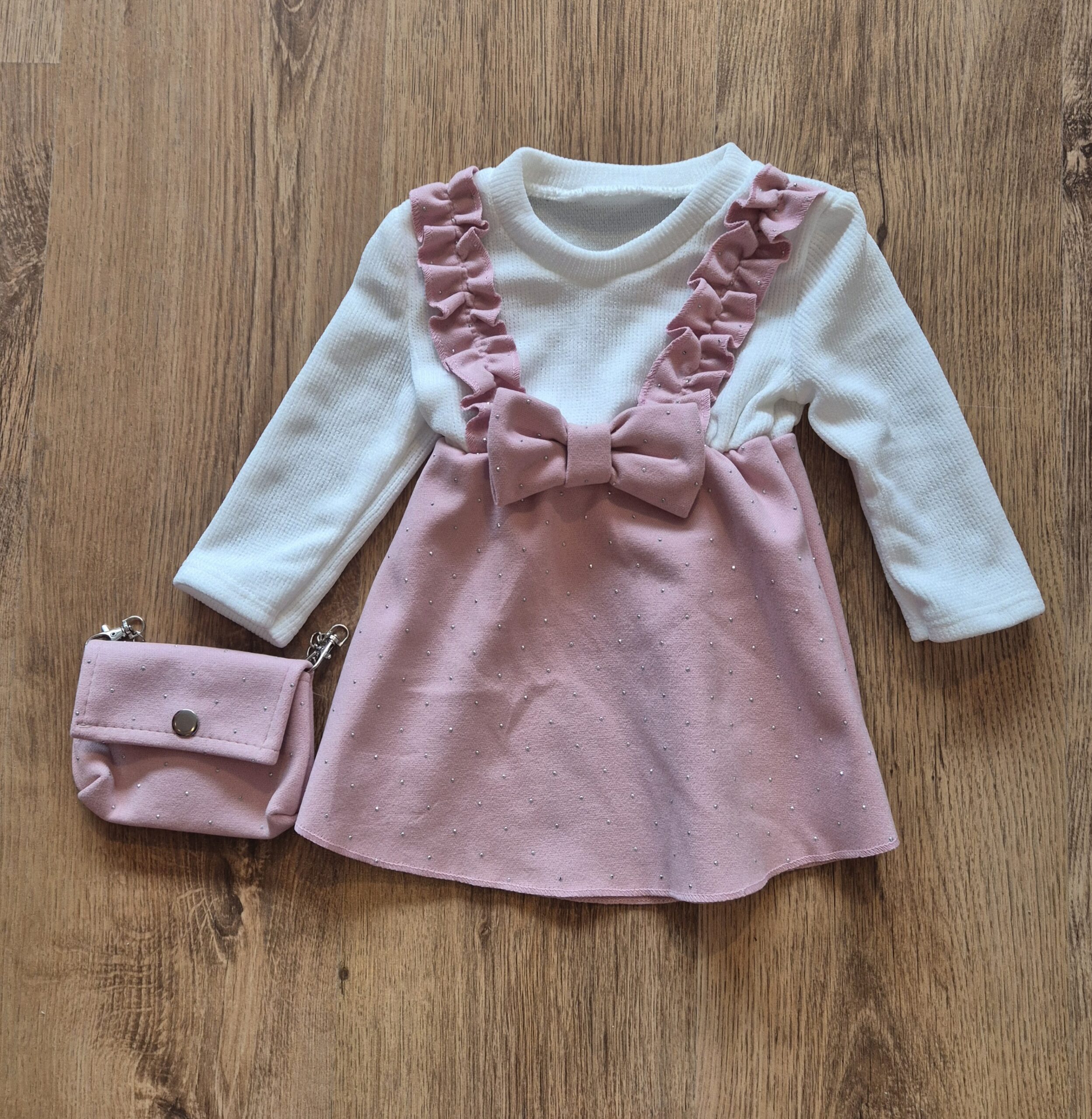 Deze schattige meisjesjurk in een zachte roze kleur met witte details is perfect voor speciale gelegenheden en feestelijke momenten. De jurk is versierd met glinsterende steentjes die een subtiel en speels accent geven, waardoor het jurkje extra feestelijk oogt. Daarnaast heeft de jurk een lief tastje als decoratief detail, wat het geheel een unieke en charmante uitstraling geeft.
